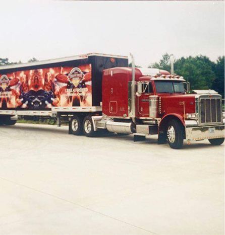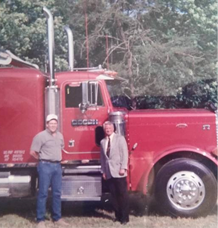 Owner Glendon Gooch posing in a picture with well known politician and Georgia Governor(at the time), Zell Miller, in front of the truck that was used to deliver the flatbed for Governor Miller.